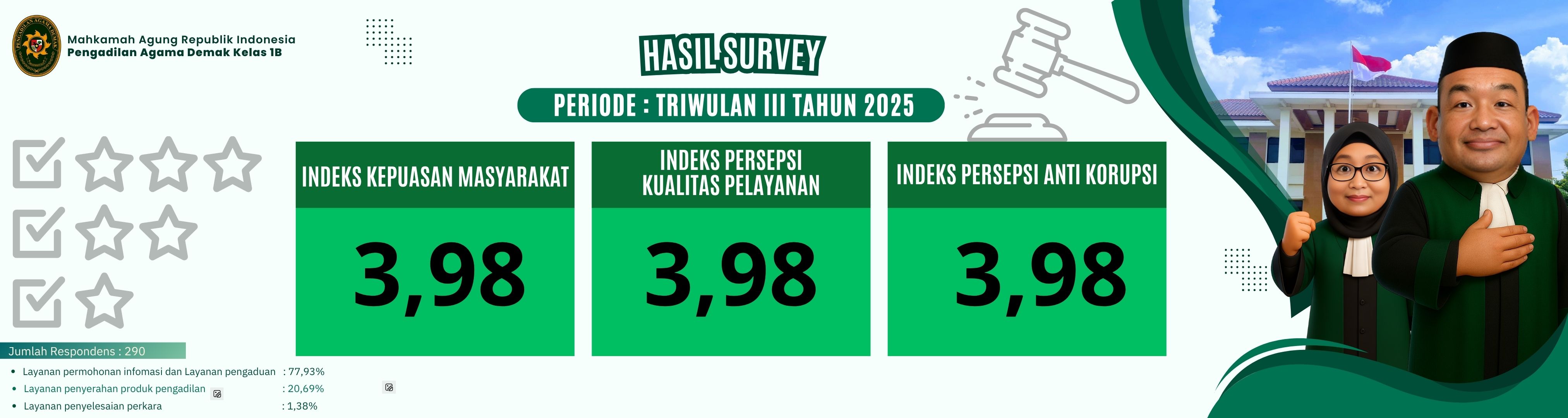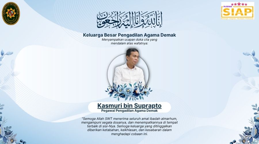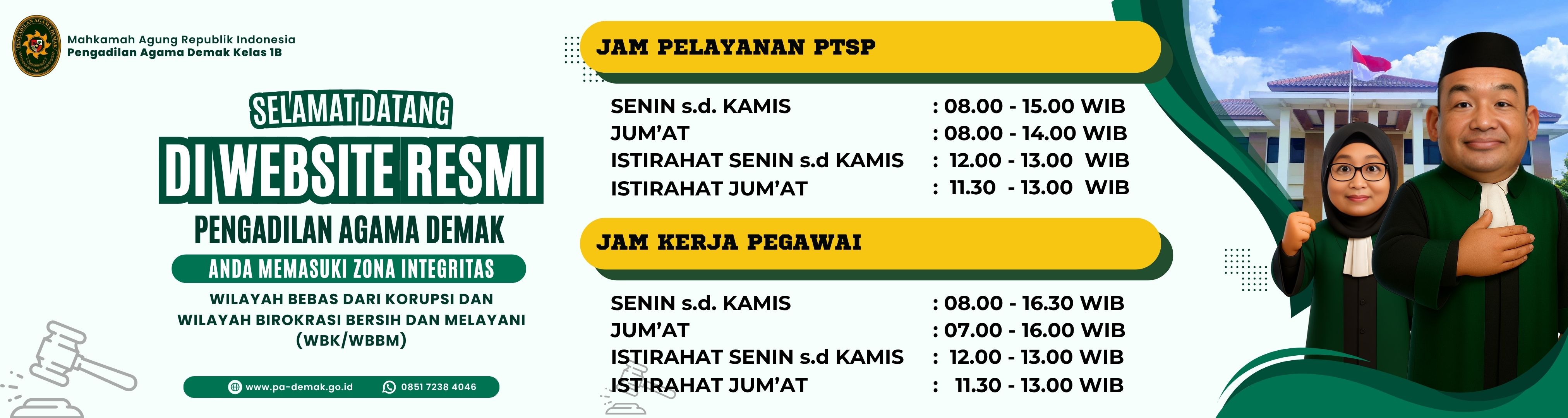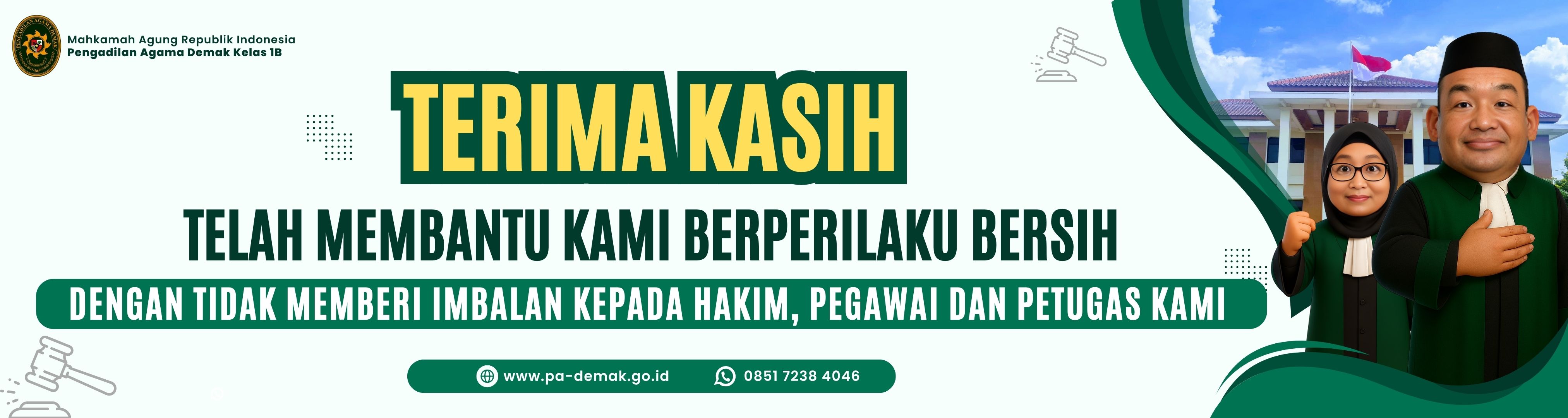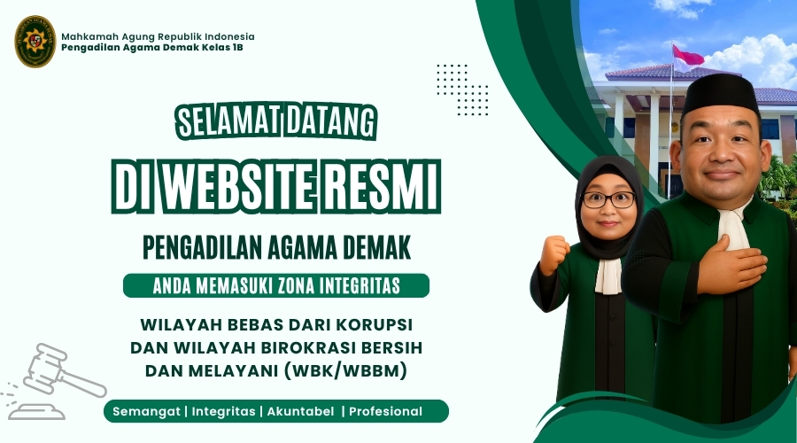 Selamat Datang di Website Resmi Pengadilan Agama Demak | Media Informasi dan Transparansi Peradilan # Anda Memasuki ZONA INTEGRITAS Menuju Wilayah Bebas dari Korupsi (WBK) dan Wilayah Birokrasi Bersih - Melayani (WBBM) # JANGAN RUSAK INTEGRITAS KAMI DENGAN MEMBERI IMBALAN DALAM BENTUK APAPUN KEPADA PEGAWAI PENGADILAN AGAMA DEMAK | Pengadilan Agama Demak "SIAP" (Semangat, Integritas, Akuntabel, Profesional)