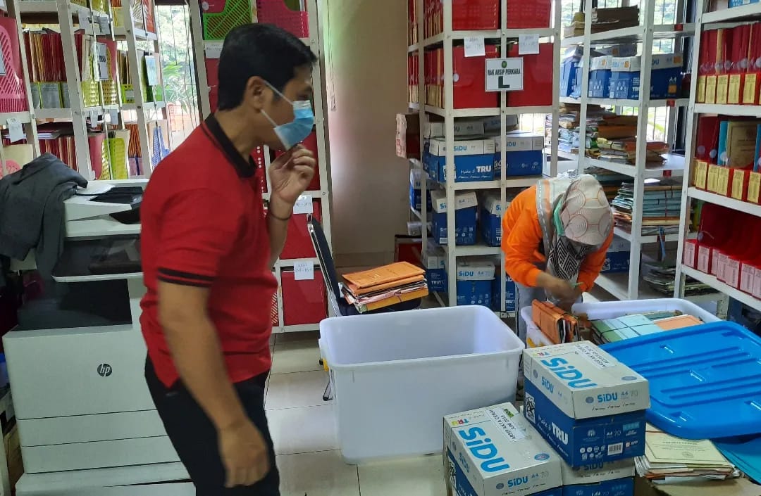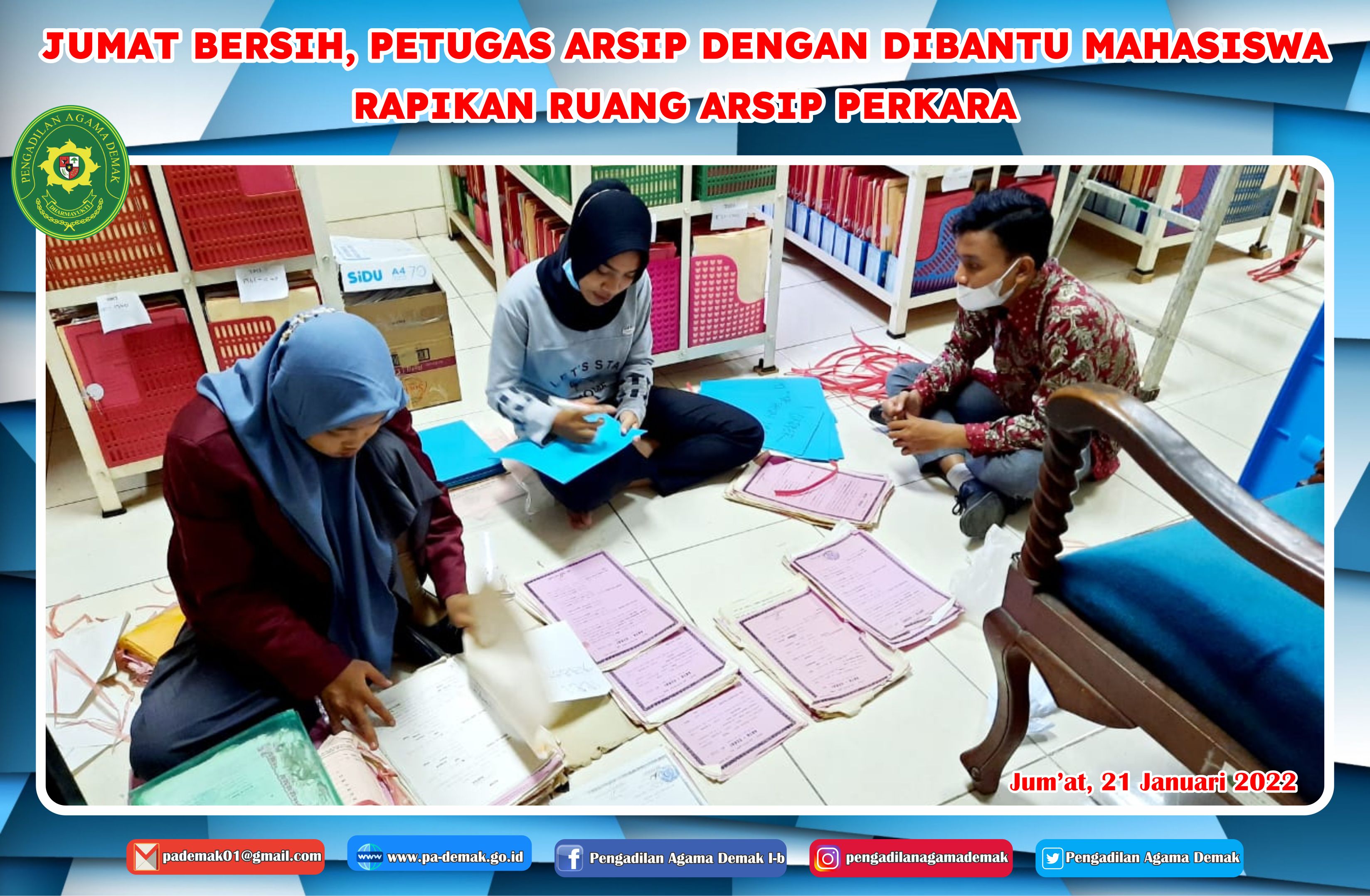 Demak. Jum’at 21 Januari 2022|| Jum’at yang cerah ini, Petugas Arsip Perkara Pengadilan Agama Demak melakukan Jum’at bersih Ruang Arsip Perkara. Kegiatan ini di Ketuai Oleh Panmud Hukum Bp. Moh Rofi, S.Ag. bersama sama melakukan perbaikan box file arsip dan penempelan kertas pada box file nomor perkara pada arsip perkara. Dalam pengerjaannya dibantu juga oleh Mahasiswa Magang dari IAIN Kudus Jurusan Bimbingan Konseling Islam.