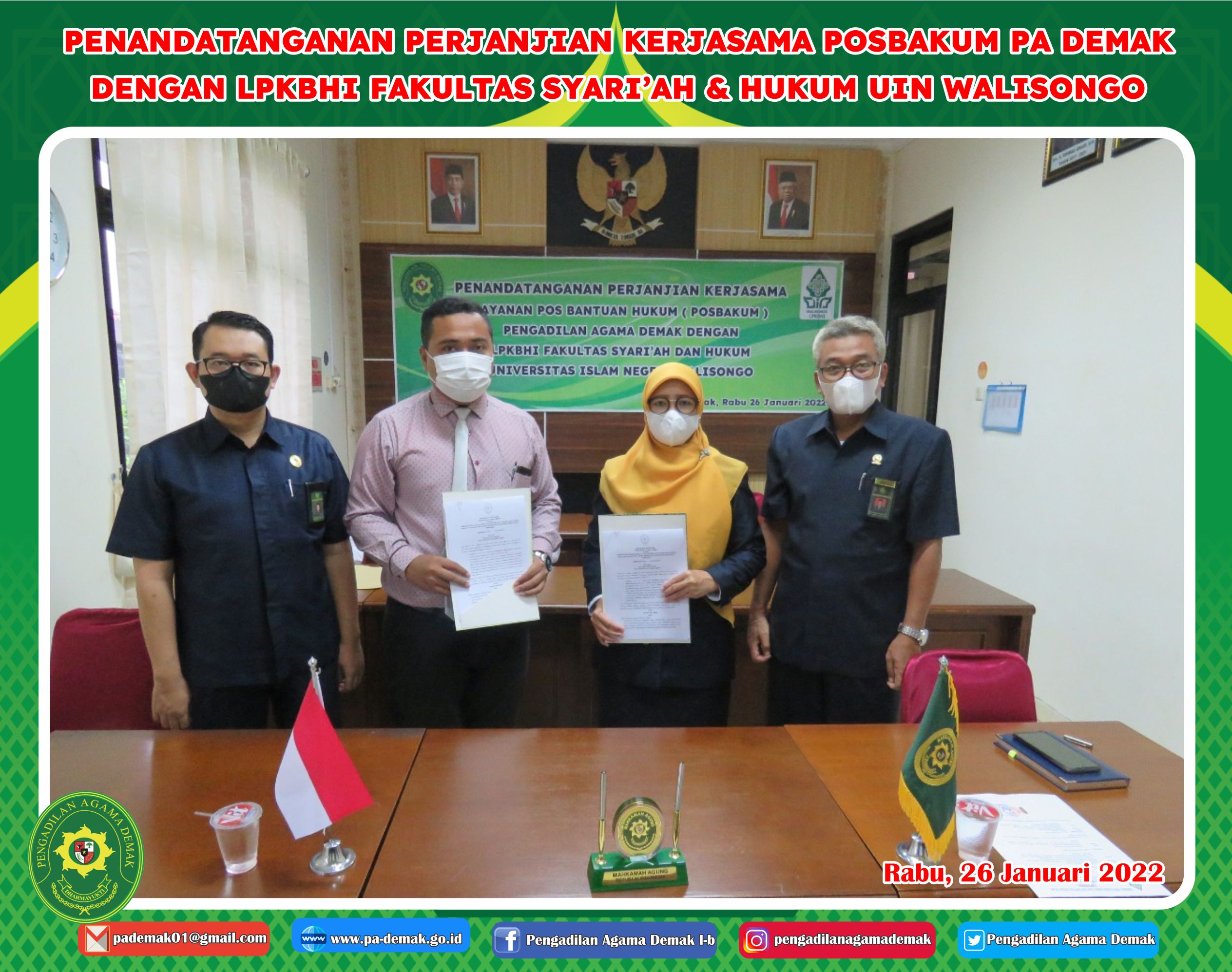 Demak, Rabu 26 Januari 2022. Bertempat di ruang Media Center kantor Pengadilan Agama Demak dilaksanakan Penandatanganan Perjanjian Kerjasama penyelenggaraan Pos Bantuan Hukum (POSBAKUM) Pengadilan Agama Demak Kelas I-B dengan LPKBHI Fakultas Syariah Dan Hukum Universitas Islam Negeri Walisongo. Pelaksanaan penandatangana kerjasama Pos Bantuan Hukum (POSBAKUM) Pengadilan Agama Demak dengan LPKBHI Fakultas Syariah Dan Hukum Universitas Islam Negeri Walisongo ini guna memenuhi PERMA No 1 Tahun 2014 Tentang Pedoman Pemberian Layanan Hukum Bagi Masyarakat Tidak Mampu di Pengadilan dan yang berisi tentang adanya POSBAKUM (Pos Bantuan Hukum) pada Pengadilan.
