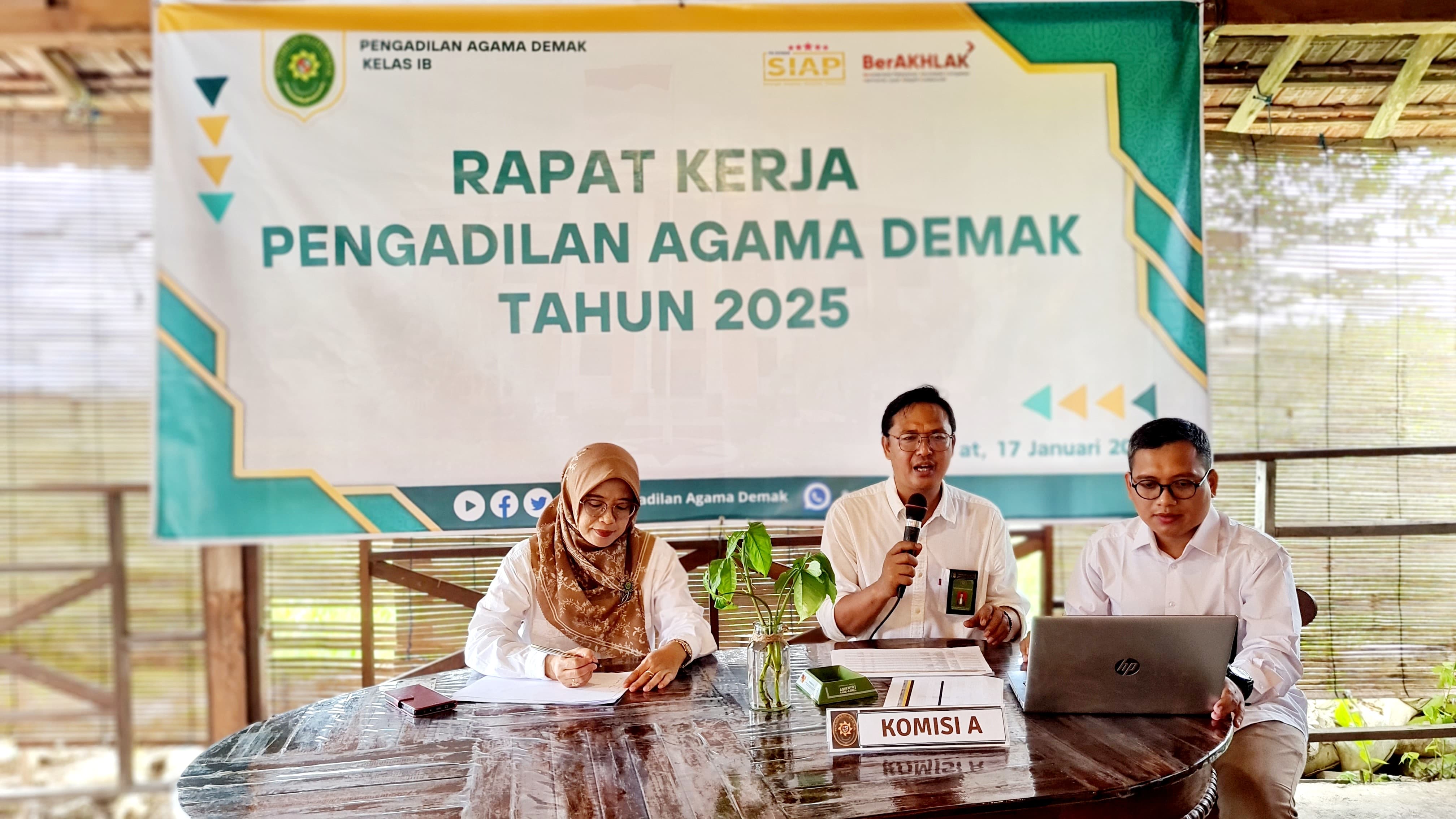 Rapat kerja yang diketuai oleh Bapak Drs. Makali ini dimulai dengan menyanyikan lagu Kebangsaan Indonesia Raya dan Mars Mahkamah Agung, pembacaan doa hingga sambutan oleh Ketua Pengadilan Agama Demak. Rapat kerja dilanjutkan dengan Focus Group Discussion (FGD) hingga pemaparan hasil diskusi masing-masing komisi yang terdiri dari komisi A Bidang Manajemen Peradilan, Komisi B Bidang Kepaniteraan dan Komisi C Bidang Kesekretariatan. Nantinya hasil FGD akan ditindaklanjuti untuk menjadi program kerja oleh setiap komisi yang terbentuk.