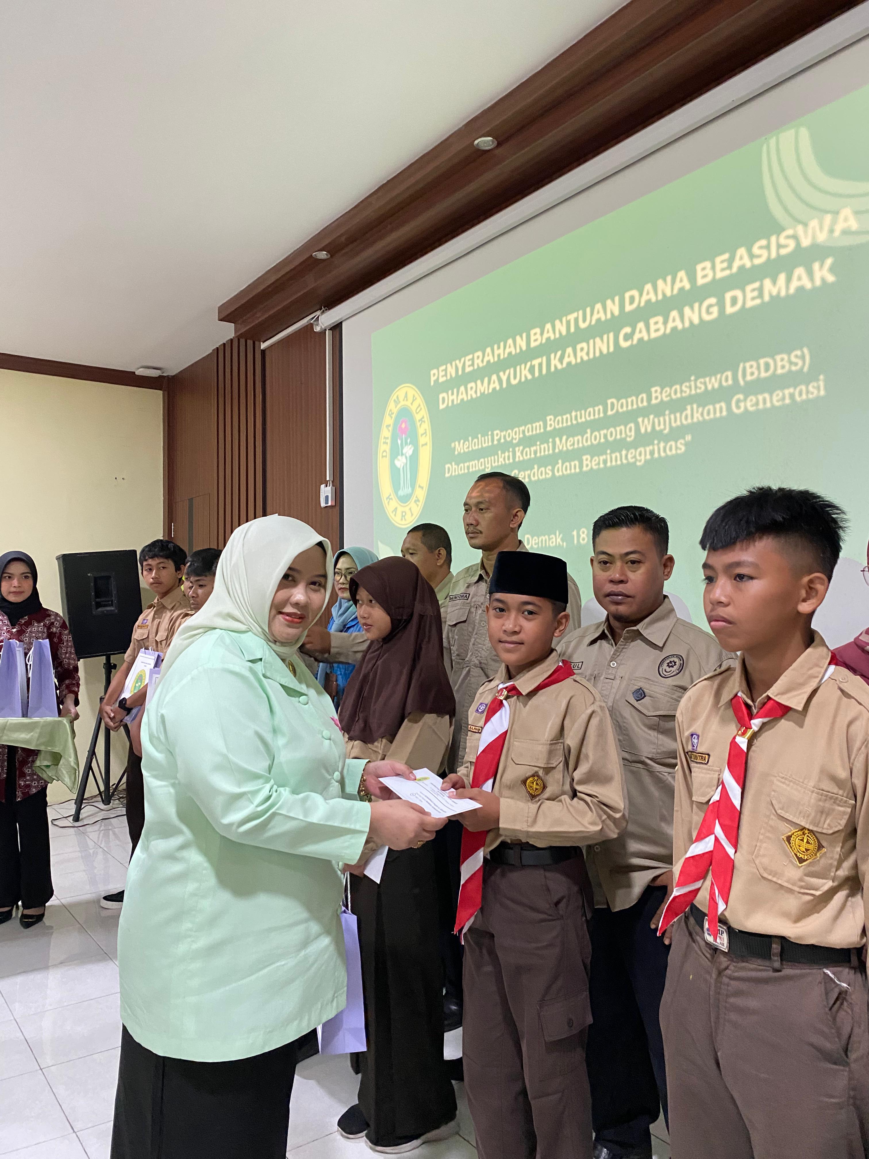 Sebanyak 10 siswa dari berbagai jenjang pendidikan, mulai dari SD hingga SMA, menerima bantuan beasiswa ini. Raut wajah bahagia terlihat jelas dari para penerima beasiswa. Salah seorang penerima. Dengan penyaluran BDBS ini, Dharmayukti Karini Cabang Demak menegaskan perannya sebagai organisasi yang peduli terhadap kemajuan pendidikan di daerahnya. Diharapkan program ini dapat terus berlanjut dan menjangkau lebih banyak lagi putra-putri anggota Dharmayukti Karini di Demak, sehingga mereka dapat tumbuh menjadi generasi penerus yang cerdas dan berdaya saing. (Hazar)