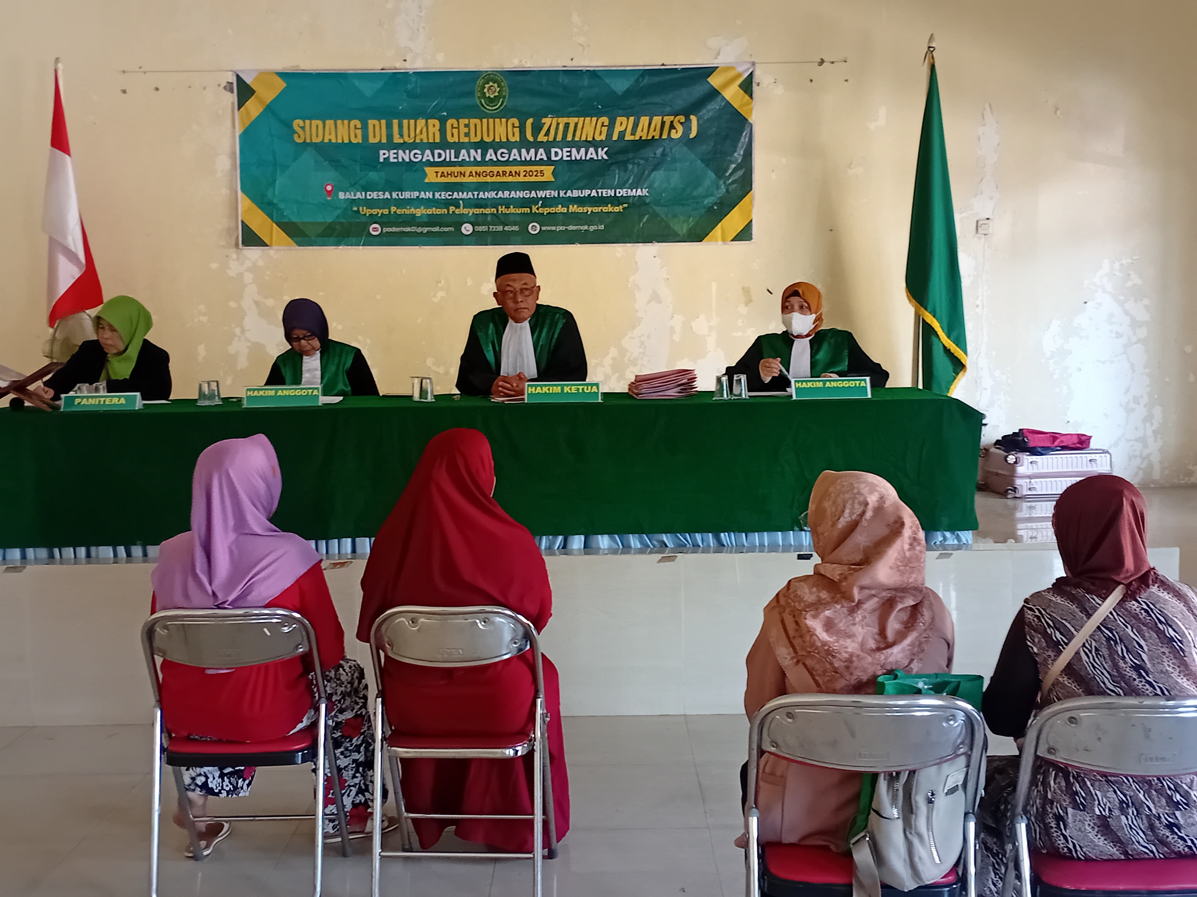 Demak – Pengadilan Agama (PA) Demak kembali melaksanakan program Sidang Keliling pada Jumat, 1 Agustus 2025, bertempat di Balai Desa Kuripan, Kecamatan Karangawen, Kabupaten Demak. Sidang dimulai pukul 09.00 WIB dengan melibatkan majelis hakim, panitera pengganti, serta petugas pendukung lainnya.