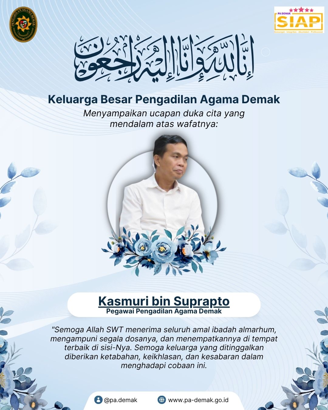 Pada kesempatan tersebut, “Tahlil dan Doa Bersama Almarhum Bapak Kasmuri.” dipimpin oleh Hakim Pengadilan Agama Demak, Drs. KH. Baidlowi, S.H..