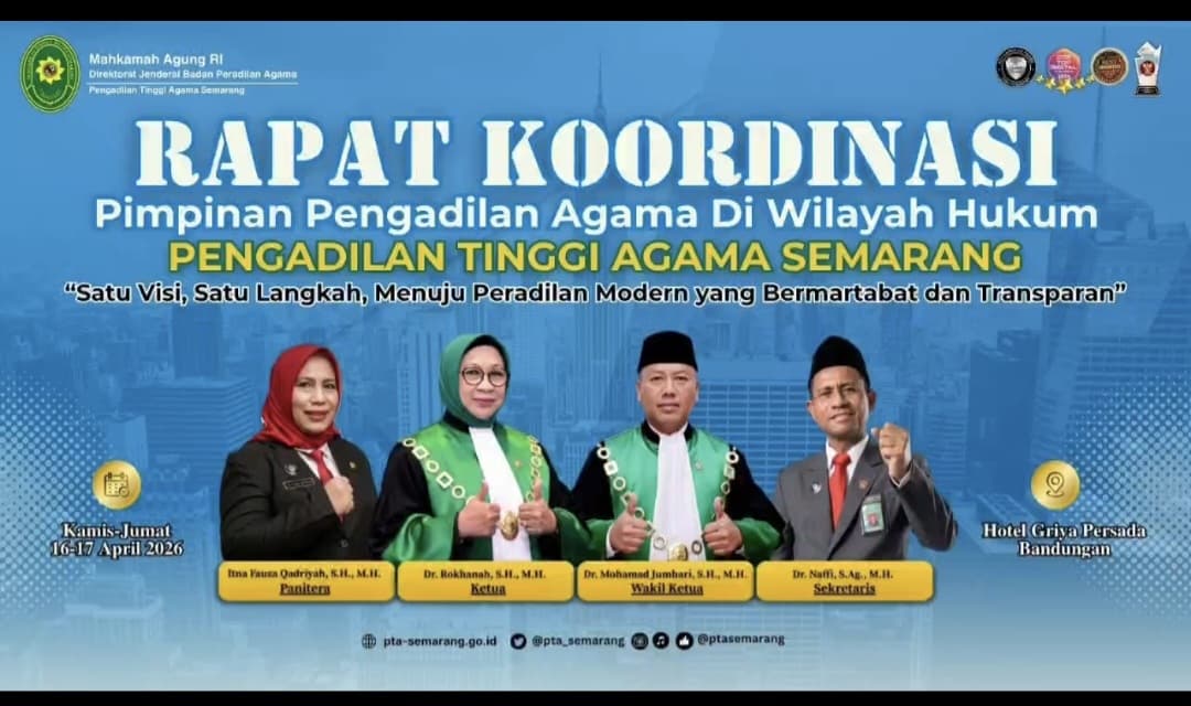 Pengadilan Agama Demak menghadiri Rapat Koordinasi Pimpinan Pengadilan Agama di Wilayah Hukum Pengadilan Tinggi Agama Semarang yang diselenggarakan pada Kamis hingga Jum’at, 16–17 April 2026, bertempat di Ayodya Ballroom – Hotel Griya Persada Bandungan.